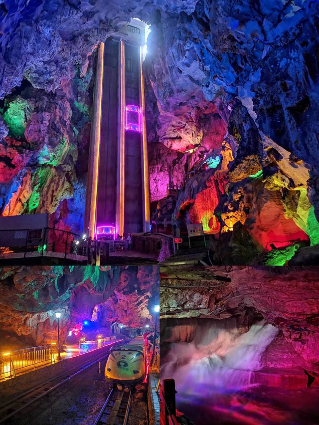 【冠岩景区】有罕见的洞内瀑布,还有观光电梯、小火车。最后不想走路还可以坐滑道车下来