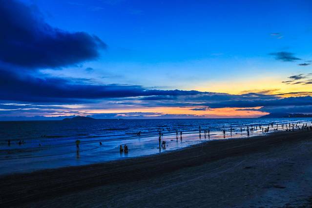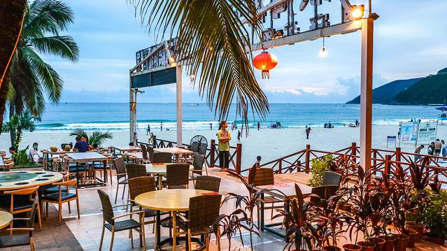 来大东海建议傍晚到夜晚体验下沙滩烧烤,很有感觉,而且当夜幕降临,大东海海边木栈道上灯光璀璨,有驻唱,有灯光秀,有音乐,特别的美妙。