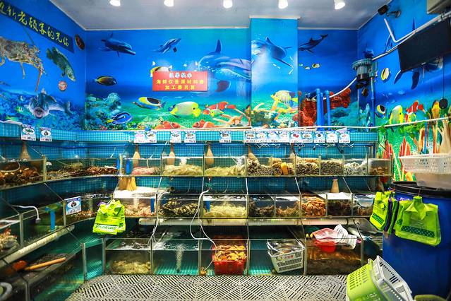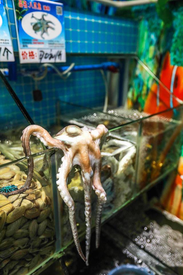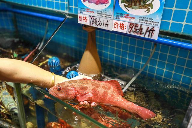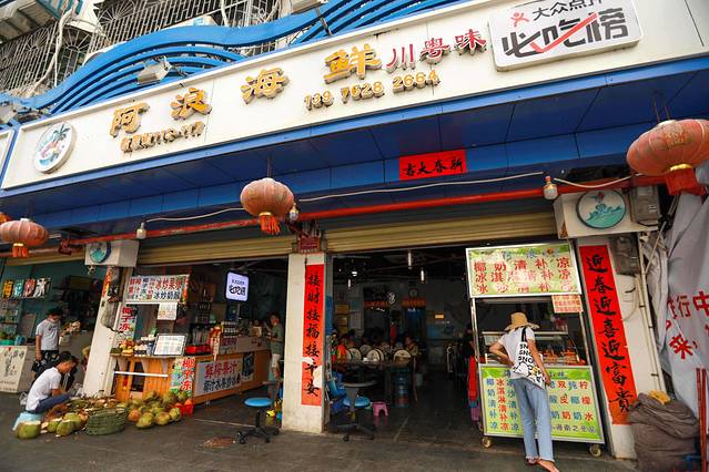 第一市场上的新民街都是加工Seafood的餐馆,我们选择了有23年老字号的阿浪氵每鱼羊,三亚第一市场旁边新民街路口第一家就能找到,店内的Seafood池随意挑选三亚Seafood,螃蟹、龙虾、贝类、章鱼等几十种三亚Seafood,现买现加工,辣炒、蒸制、白灼等多种烹饪方式,随你任选,三亚自助小料准备了蒜泥、辣椒粒、青柠檬、芥末、酱油、醋,可以自己DIY,也可以叫店员帮忙调制。三层都可以坐,二楼更凉快一些。