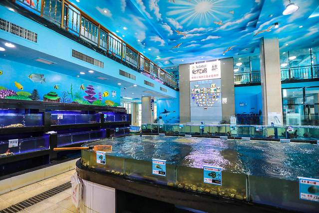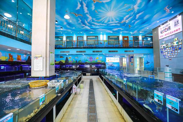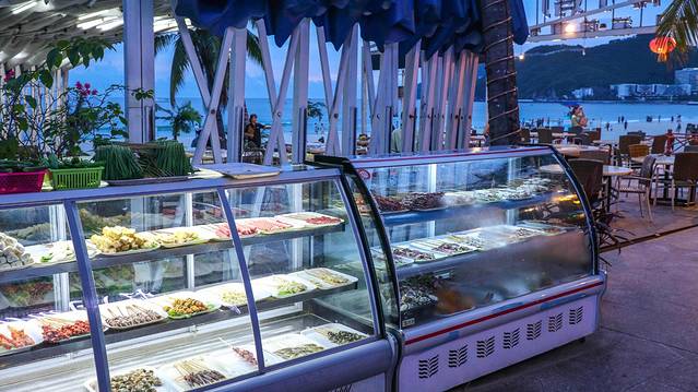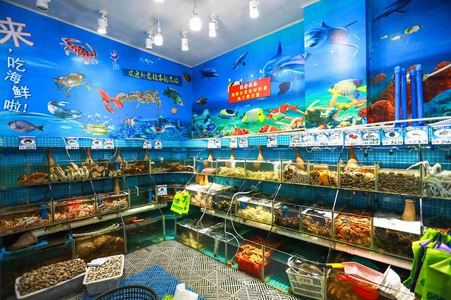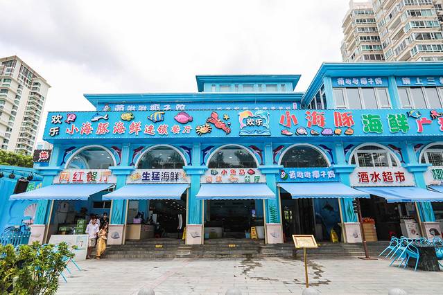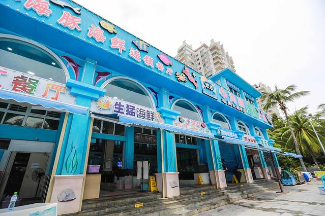 在三亚湾椰梦长廊,金鸡岭与三亚湾路交叉口,一座如蓝白相间的房屋吸引了我的注意,仿佛走进了海底世界,墙壁的涂鸦,美人鱼、小海豚映入眼帘,一楼的Seafood自选超市并提供加工,二楼干净整洁的用餐环境。