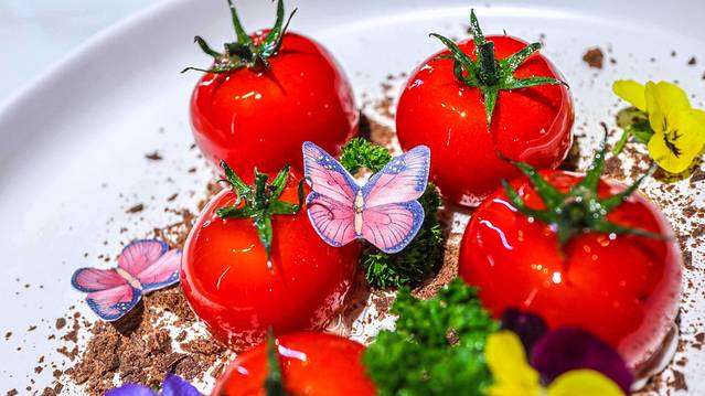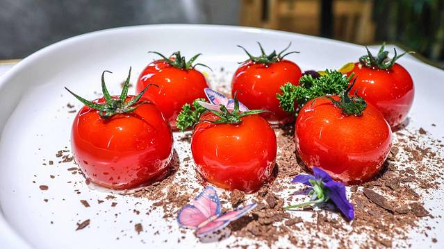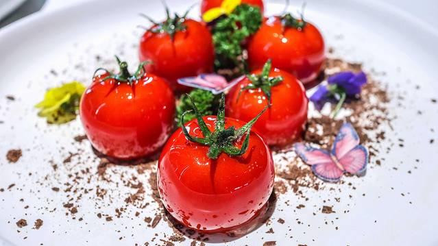 非常喜欢的一道菜,每一个都是真实的小番茄,晶莹剔透,里面还有很有“料”,水果沙拉加入了坚果,放入被挖空的小番茄中,吃起来更加的香脆爽口。