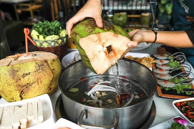 3个新鲜的椰子水下锅,再加上一瓶纯净水,简单的食材,确实营养丰富,花胶、木瓜、文昌鸡这些下锅后,3分钟时间,散发着浓郁的椰香的鸡汤。