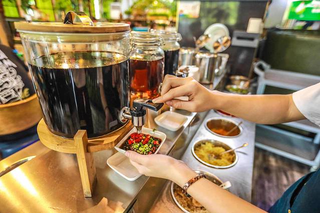 可以让服务员帮忙调制一份椰子鸡的蘸料,蒜泥、醋、酱油、花生碎、小米辣、青柠等调制出的蘸料,蘸着文昌鸡吃,味道更佳美味。