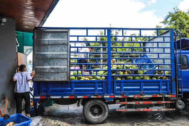 门口现场砍椰子,这里的椰子都是三亚本地,每天早晨运来的很新鲜。中午去吃饭,正在卸货,现砍现做。位子在第一市场附近,情人桥对面,吃完逛逛当地夜市很赞。