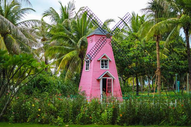 椰梦长廊也有像小东海一样的摄影基地,玻璃房、鸟巢、粉色的巴士、梦幻的欧式房屋、直升飞机等十几个可以打卡拍照的地方。