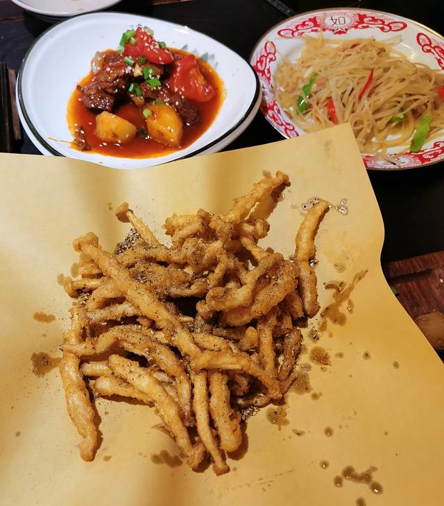 炸蘑菇、番茄炖牛腩、海米土豆丝