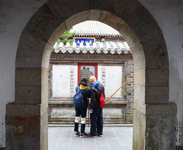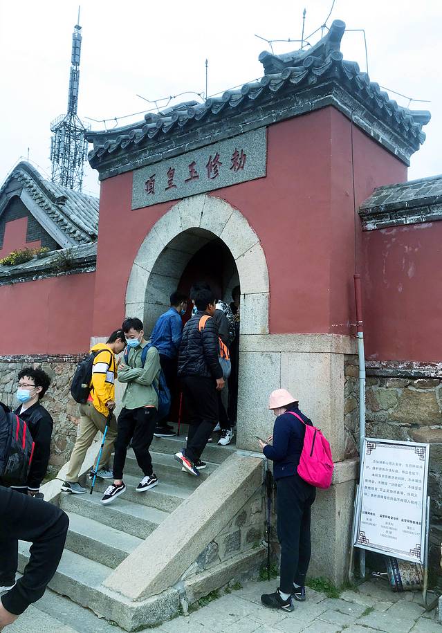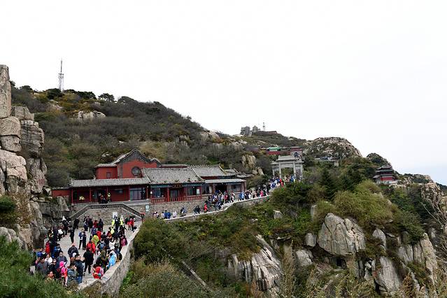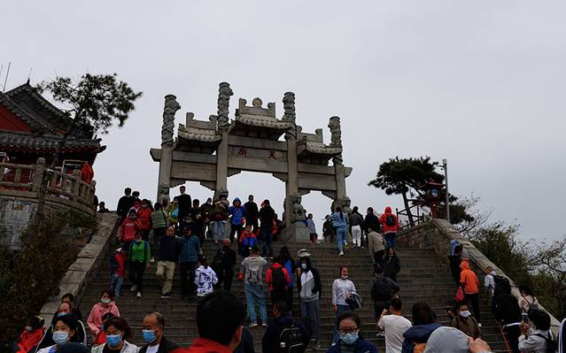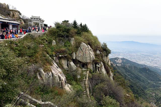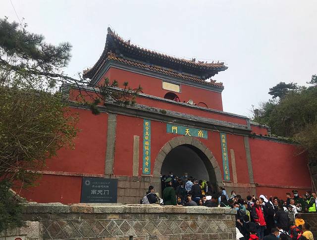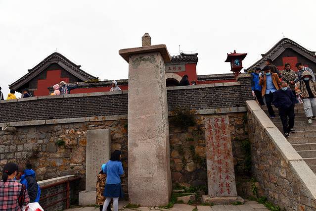 南天门。南天门坐落于飞龙岩与翔凤岭之间的低坳处,双峰夹峙,仿佛天门自开。由下仰视,犹如天上宫阙,是登泰山顶的门户。门内有小院,正殿为三灵侯殿,宋真宗冬封泰山时建,祀周谏官唐宸、葛雍、周武三人,后改为关帝庙。