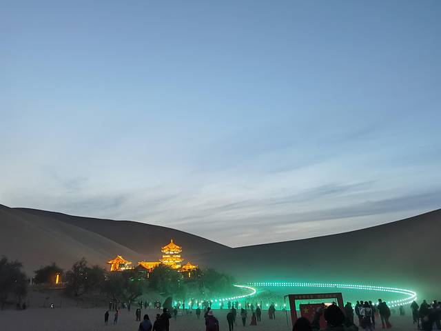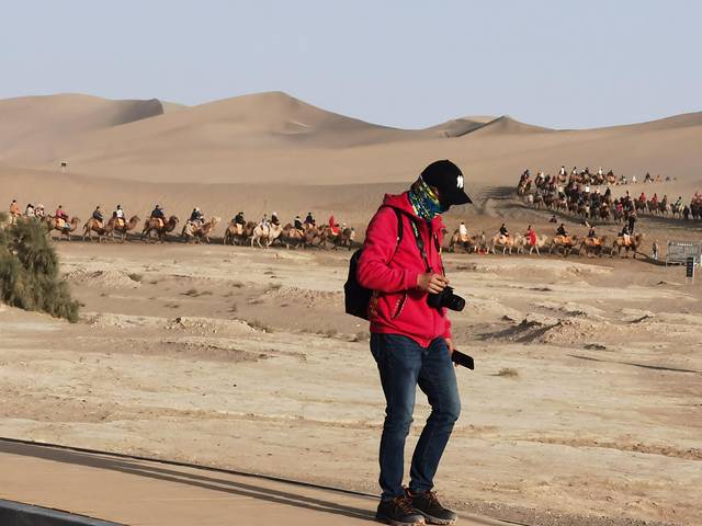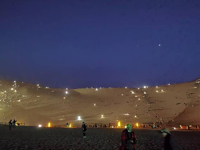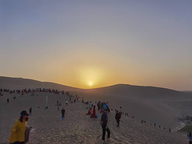 看完表演杀去鸣沙山,冲上山顶看日落,拍照,太难爬了那个沙山。日落很美,人很多,风很大。想要拍照最好还是坐越野车坐到人少的地方比较好拍。
