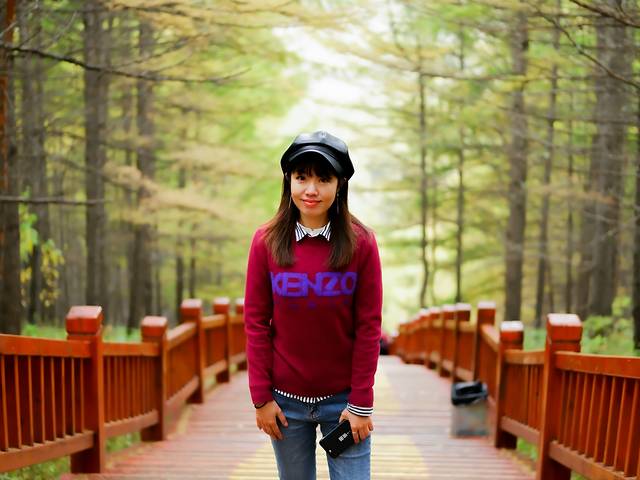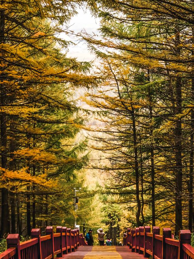 学会用不同的角度去看世界,你将看见不一样的风景。天池没有给我多大的惊喜,反而是下山最开始的一段红色木栈道上的景色惊艳到了我,两侧树木茂密错落有致层次感强烈,气温的变化使得叶子黄绿相间,绿色是冷暖边缘的中立者,通过两侧树木的引导线可以看到远处的小村庄,我和伙伴都惊叹像油画一样。