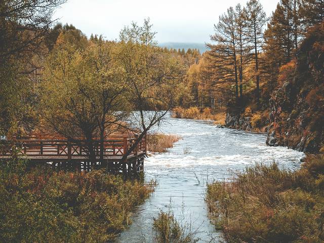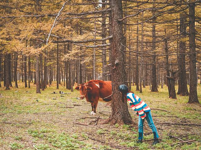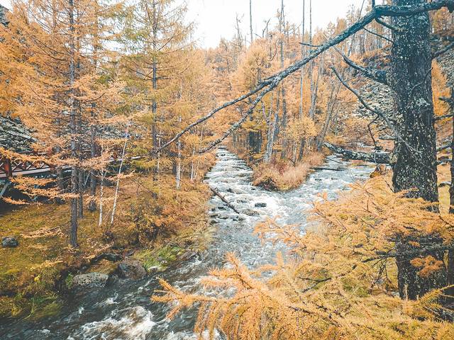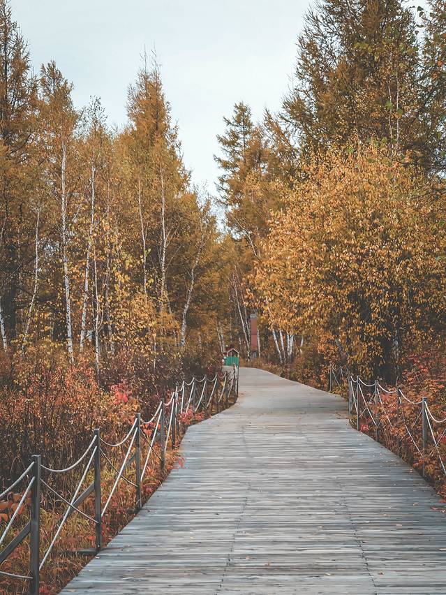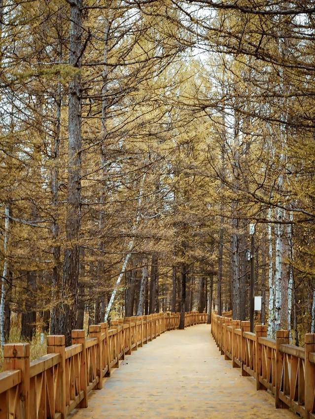 秋天的落叶松松针脱落在木栈道两侧,枯草与落叶像厚厚的绒毯踩上去软软的,还能幸运地看见丛林小松鼠,乌黑的大眼睛拖着毛绒绒的大尾巴在林中上蹿下跳,记得带上好吃的坚果给它们。