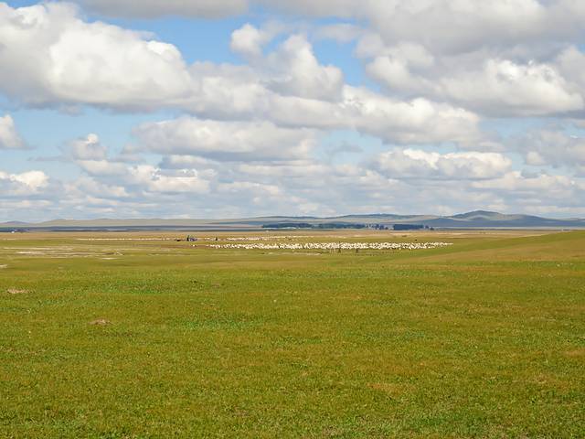 莺飞草长的草原上空是棉花云,飘来飘去,很悠闲,莺飞草长的草原和悠闲的云搭配在一起是无比伦比的合适,美得不能再美。