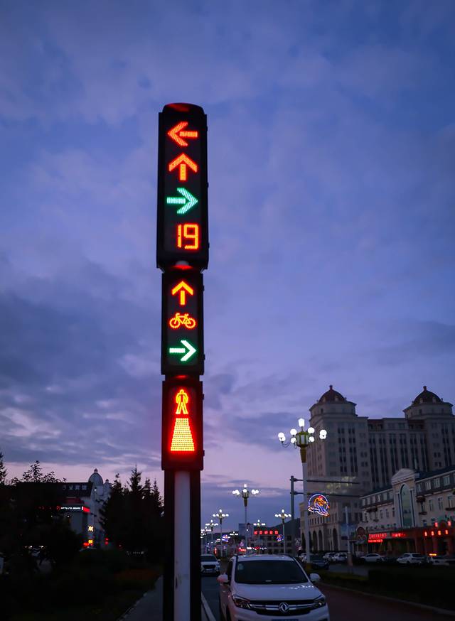 你看这里的红绿灯是不是很有特色,竖版上面带箭头。