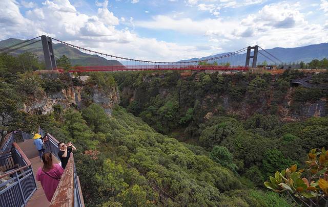 走在玻璃栈道上只要一直往前看,就没有任何的害怕,却往脚下一看就感觉有些发抖,好在同行的几个人一直在聊天,使得我的注意力不在注意脚下也消除了恐惧。走过玻璃桥从旁边的栈道下到谷底,这个山谷大概有百米的高度,谷底树木茂盛流水潺潺,第一次看到了峡谷的景象之后,终于相信金庸武侠里面那些悬崖边,深谷底的故事并不是凭空想象的,我们这些一直生活在钢筋混凝土城市下的人难以体会在峡谷的感觉,不过峡谷中也有不少的人造景点,主要是在讲述了茶马古道的故事,以茶易马。