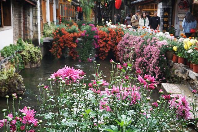 比较奇怪的是这里的人家家都有三角梅还有多肉,三角梅自己家里一直也有种植,不过长势比较差一些,走到哪里都能觉得是在花海中漫游,或者是丽江古城最适合一些喜欢花的人来观赏,四方街是人最多也是花最多的地方,现在又是菊花盛开的季节,广场上摆满了各类的菊花,颜色也是多姿多彩的。小河边的菊花好像瀑布一样从河岸挂下来,随时都要流到河水里一样。虽然是摆放但是没有经过设计,毕竟这么多花随便摆放都能吸引住不少人。