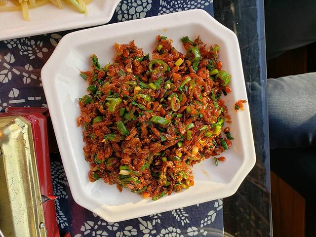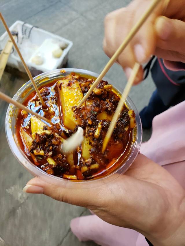 16:45到了铜仁凤凰飞机场,小城市用不了打车软件。要不乘坐15元的中巴,但是要无限时间的等,只能打车,打车到铜仁市区要120元,我们三人,如若可以再上一人,就100元。我们选择了100元,机场到市区开了50分钟。其实最好是在机场选择租车,只是我开车技术不好,我姐技术好但顾虑很多,所以第一天没有选择租车。6点左右入住了铜仁市蓝波湾小区,在锦江边上,地理位置绝佳,吃喝玩乐逛都方便。心心念念要吃酸汤鱼,从美团上找了一家,导航过去,一路上看到小吃就买就尝一点,贵州的辣椒粉香而不辣,真的很好吃,大爱他们这的美食。