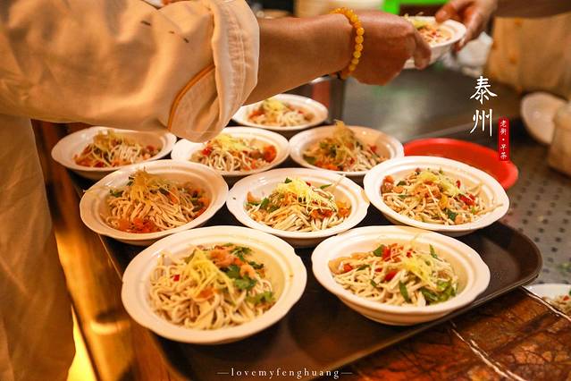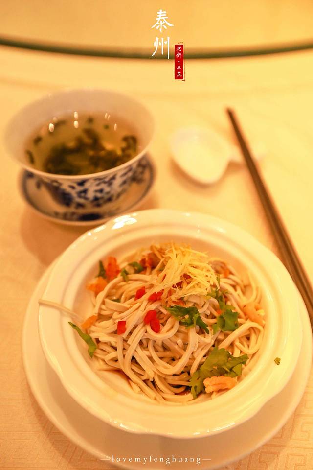 和扬州一样,泰州人至今保留着吃早茶的习俗,传统的泰州早茶,要搭配“一茶三点一面”,一茶就是一杯茶和一份烫干丝,一份烫干丝叫一个茶头;三点就是说三种泰州的著名早点,即包子、蒸饺、烧卖;一面就是鱼汤面。