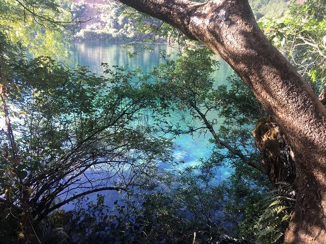 小岛上的植物郁郁葱葱,从树隙间看到的湖水竟是不同颜色的