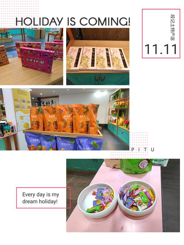 逛累了,在街边的一家小吃店,一人点了一份凉鸡米线。这家店的凉鸡米线我挺喜欢的,米线口感很劲道,冰凉爽滑,鸡丝很柔软,酱汁酸甜可口,特别棒!离开之前,还去了段记土特产店买了很多的土特产。这家店有香飘四溢的诺邓火腿、酸甜可口的雕梅、花香沁心的果酒和花果茶、极具云南特色的云南十八怪果脯拼盘等,都很好吃。真想把整个店都搬走~~