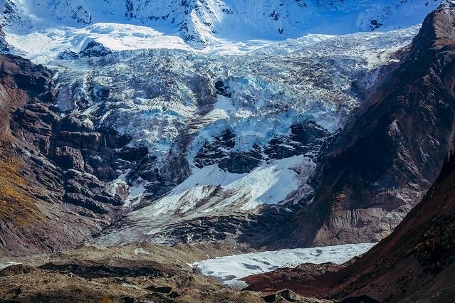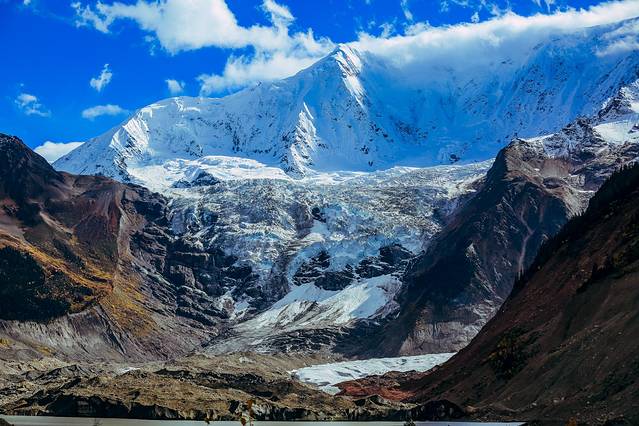 冰川主峰海拔6800米,雪线海拔只有4600米,常年雪光闪耀、景色神奇迷人。冰川冰洁如玉,景色秀美,形态各异,姿色醉人。