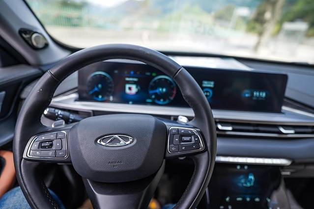 多功能方向盘,驾驶的时候也能轻松操控。换档拨片就在方向盘下方,手不必离开方向盘,就可以轻松切换,特别是在上坡需要手动切换低档位快速超车的时候,有一种找到赛车手的感觉。