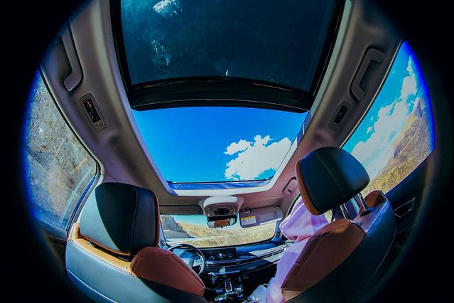 爬到山顶,有些累了,就打开瑞虎8 PLUS的超大全景天窗,蓝天白云,仿佛触手可及。