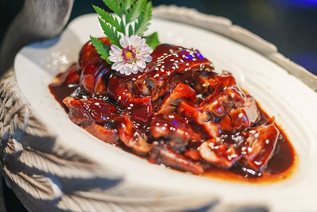 👉一绝酱鸭,这容器很亮眼啊,一只鸭子上桌仪式感十足,酱鸭红润香甜,入口软嫩。