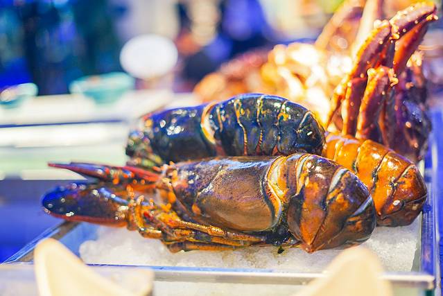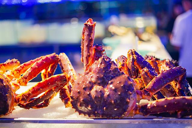 👉海鲜区是最大的主角,种类繁多,池子里的和已经上盘的都有。最大王牌必须是帝王蟹和波士顿龙虾。服务人员全程会在柜台前拆卸他们,切剪开来,分装在盘子里供大家自取,吃起来非常方便!
