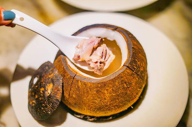 椰子鸡盅,小火慢炖6小时,椰味芬芳,鲜甜可口,实为鸡汤中的上品。
