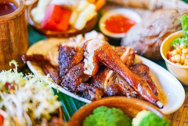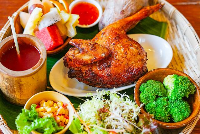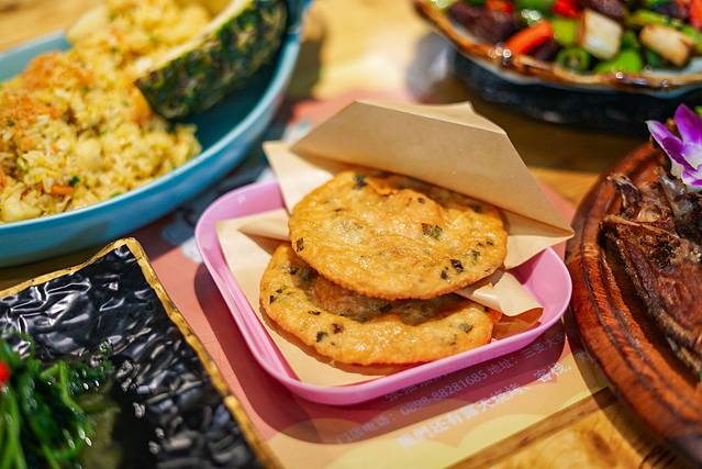 👉黎族的特色美食——簸箕餐,用簸箕作为容器,铺上芭蕉叶,烤文昌鸡或是藤桥蒜香排骨…再放上各种搭配美食,五颜六色,秀色可餐!