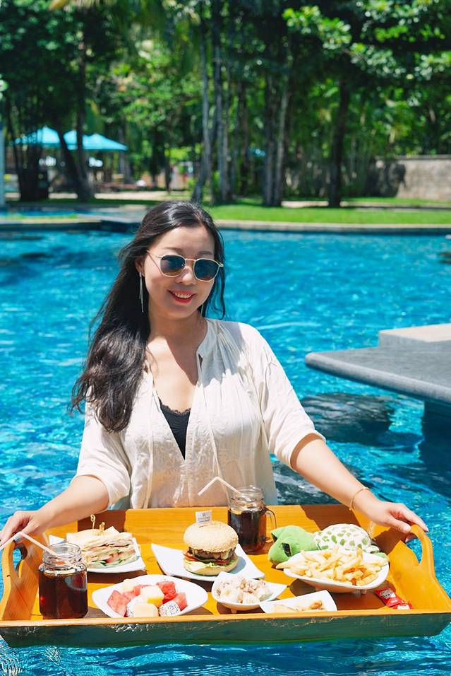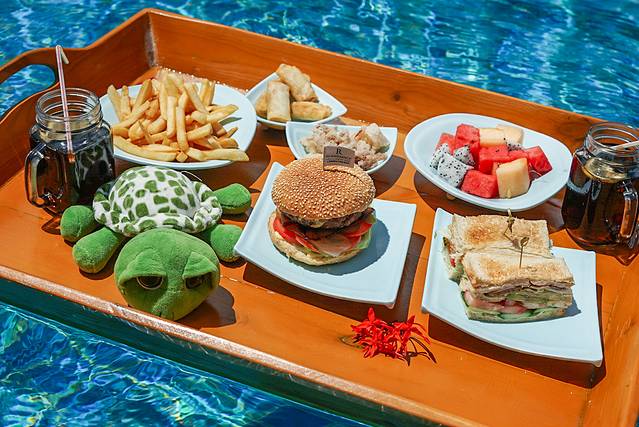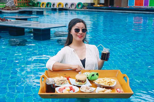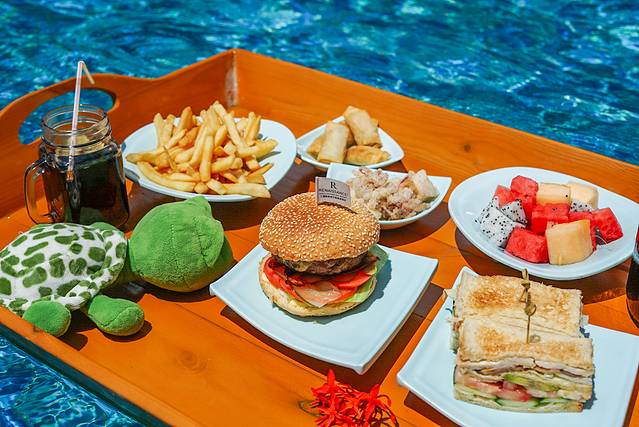 👉目前最流行的网红漂浮餐,办理入住的时候就提前预定上了!🏖温暖的阳光,清澈的泳池,美美的一餐,是来到海棠湾的必打卡项目哦!除了正餐,还有漂浮下午茶…哎呀我要泡在泳池里,不想出来啦!