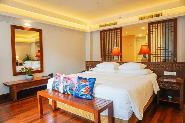 房间宽敞舒适,温馨舒适的家居感觉。整体装修融入中国古典元素,古朴藤条家居装饰凸显清凉惬意,宽敞阳台享受海南森林氧吧清新好空气。池畔房更可以房间与泳池瞬间切换,享受水中嬉戏的乐趣!