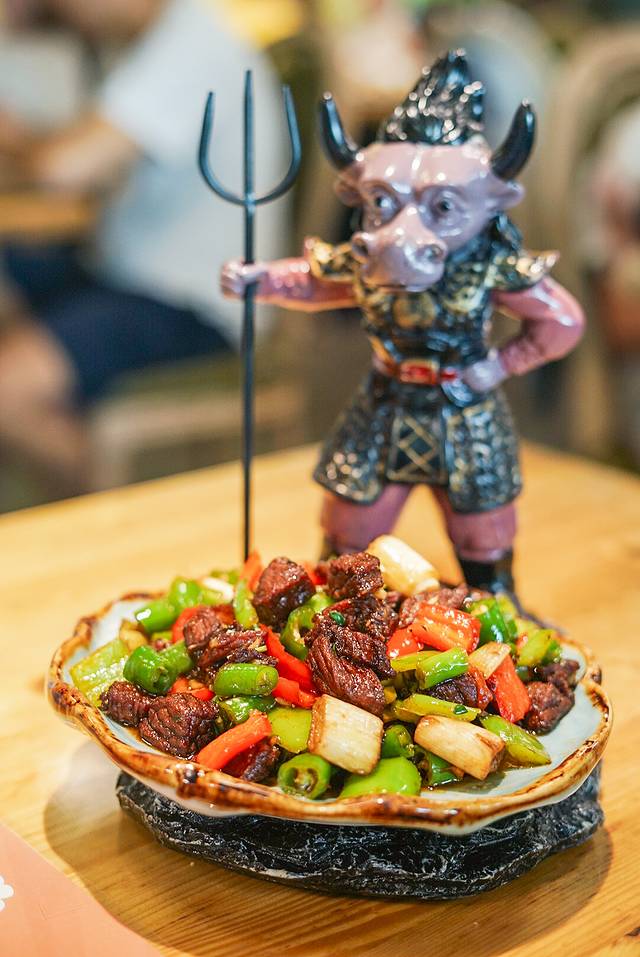 💫五指山小黄牛肉粒,造型太有趣了,居然用牛魔王的造型盛放,牛魔王上桌了,必然是道横菜,牛肉粒量大诱人,口感香嫩可口,搭配青红椒爆炒,味道超赞!