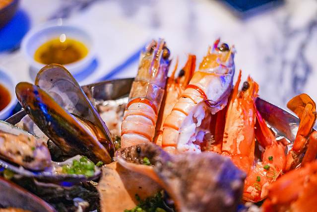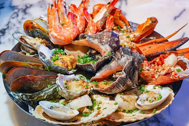海鲜大餐以套餐的形式呈现,主角当然是霸气的海鲜拼盘了。可以选择冷盘也可以是选择全部热食,非常贴心!海鲜全部从来自本地采购,餐厅中间有贝类陈列池,直观又震撼。