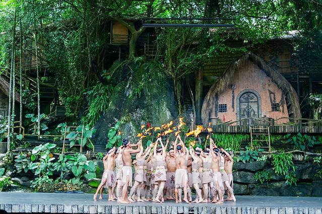 已蜚声国际的黎族打柴舞、舂米舞,生动的将黎族生活展现在这舞台之上;原始的钻木取火、自制的黎族乐器、世界级非物质文化遗产——黎锦纺织技艺等,也被巧妙地融入歌舞演出中。