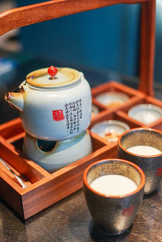 👉落座后,首先当然要点一份转动的石磨研磨出来的豆浆!豆香浓郁,入口温润,店里还配了小食可以搭配,坚果、红枣都不错。
