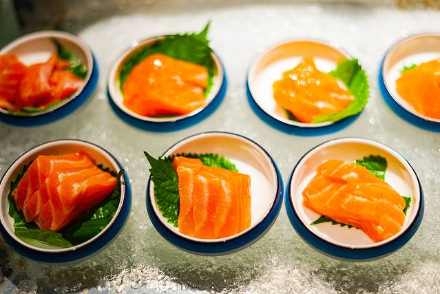👉刺身区:三文鱼、金枪鱼、北极贝、牡丹虾、鳌虾……