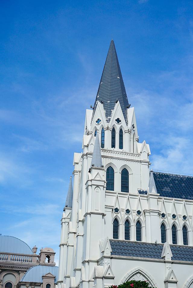 欧式风情的街区,几座建筑本身就是很好的拍照场景了,白色教堂很有神圣感,加上这里现在成了婚纱照拍照圣地,所以也能看到不少拍照“道具”在这里。