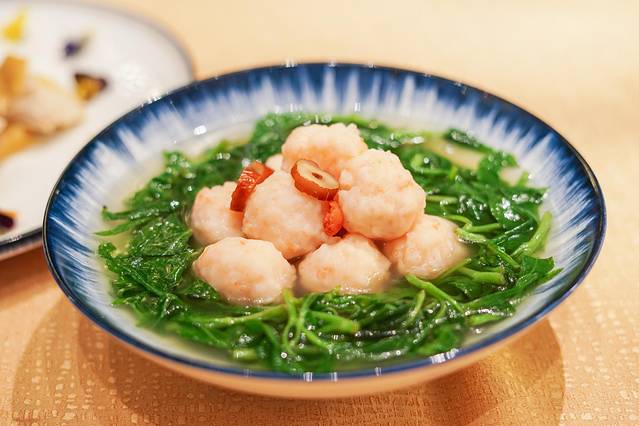 💫手打鲜虾滑鸡汤浸鹿舌菜,虾滑弹软,清淡有滋味。