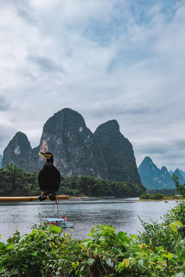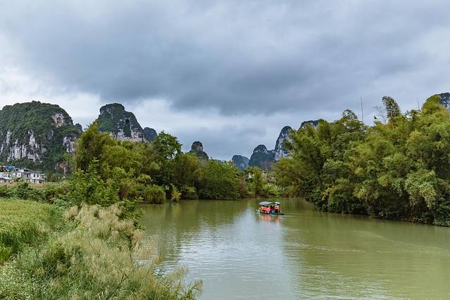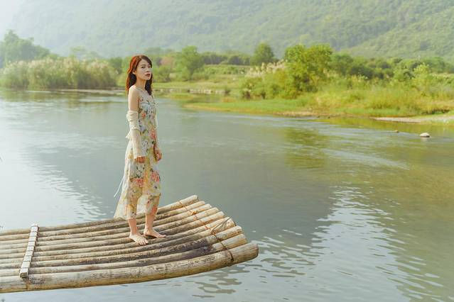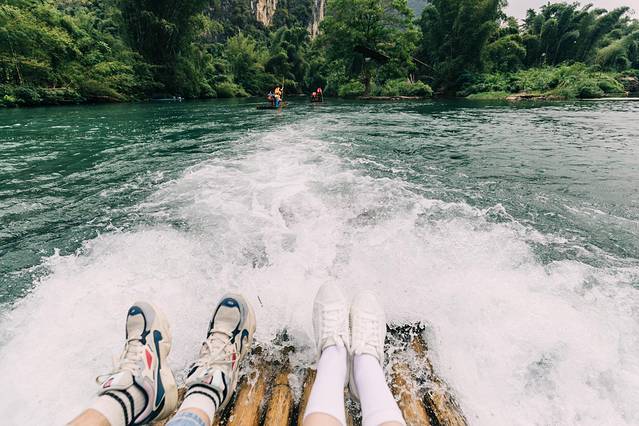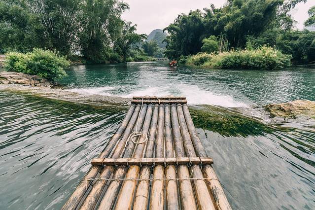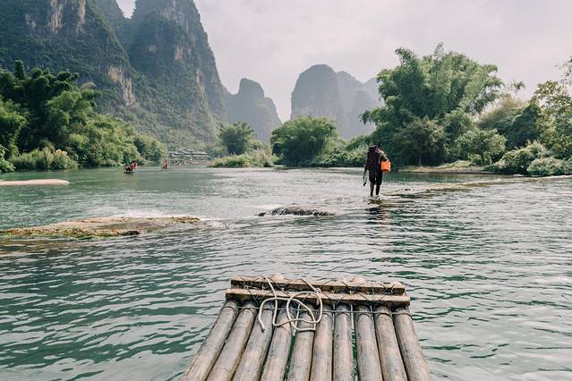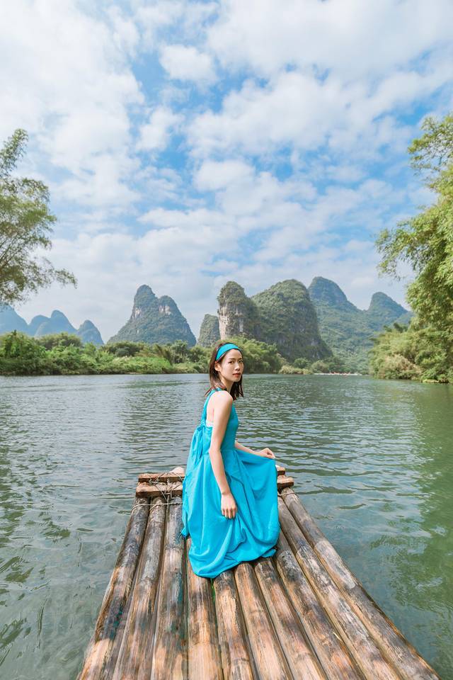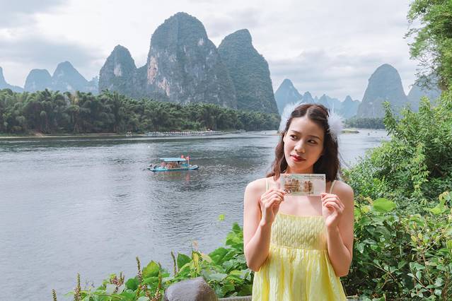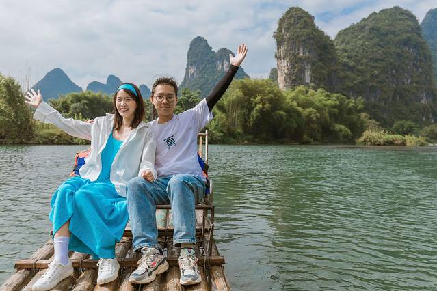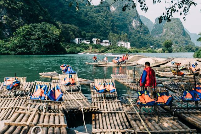 如果你坐漓江的漂流,那就可以选择【兴坪—九马】这段漂流,因为这是漓江的精华段,20元人民币、老寨山、相公山、九马画山等都能看见。因为漓江水深,漓江的漂流竹筏是电动的,马达声音很大,缺少了意境,所以我们没坐,更推荐去遇龙河坐人工竹筏。