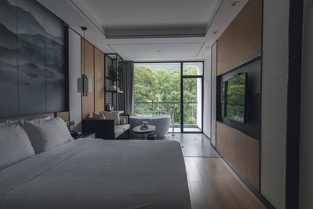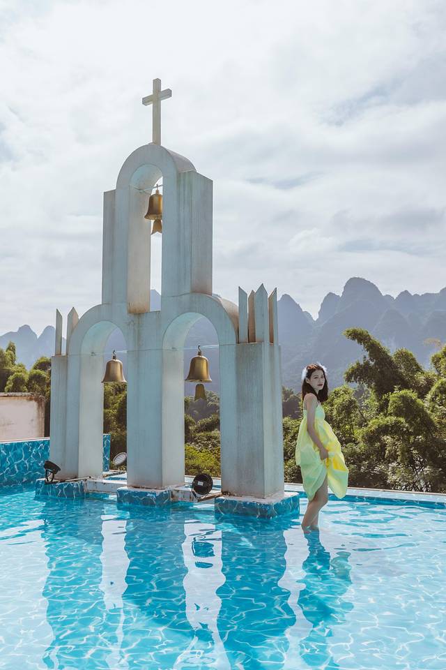 位于漓江边,距离兴坪古镇2km。这家酒店也有浴缸,不过我们没时间泡澡。这家有阳朔高铁站免费接送服务,前台服务、早餐都很不错。他们的天台有“圣托里尼”风格的拍照布景,还有一个无边泳池。