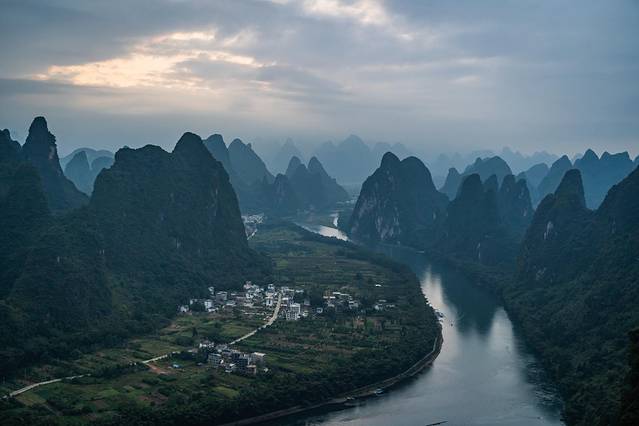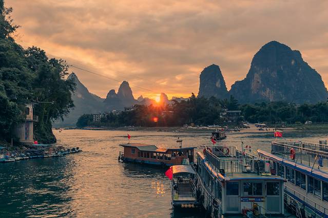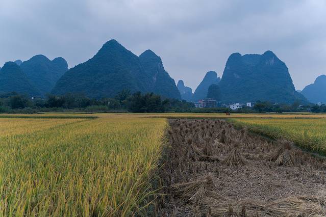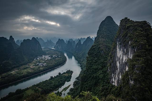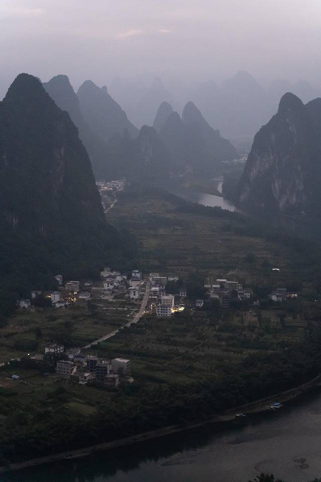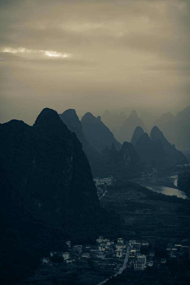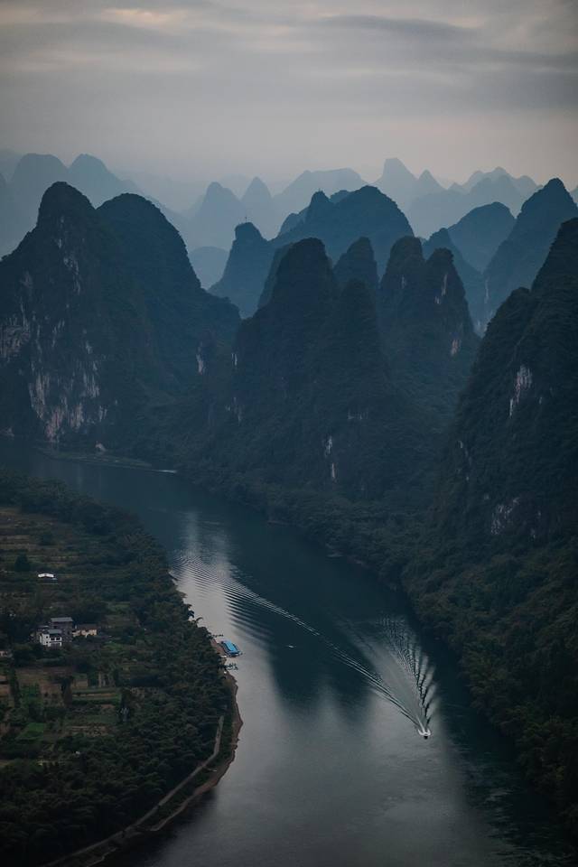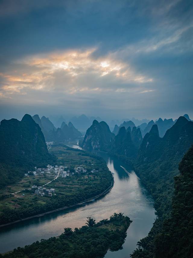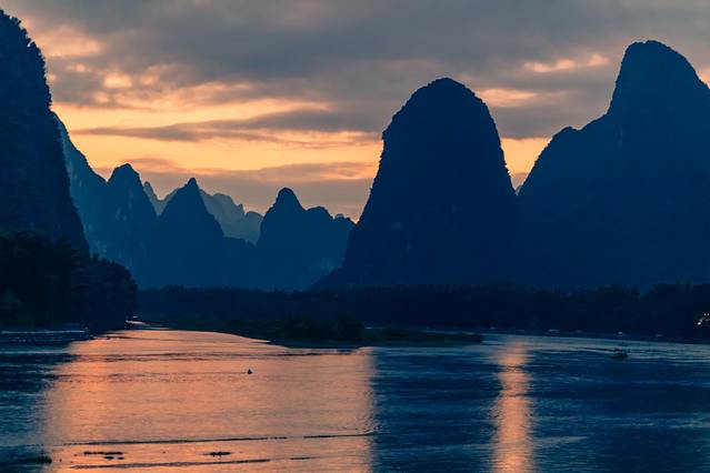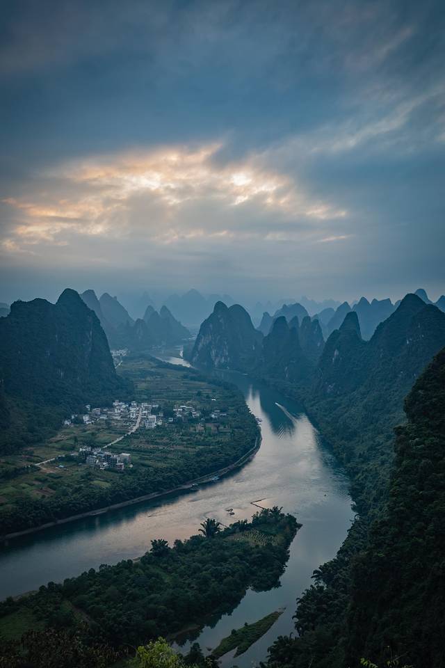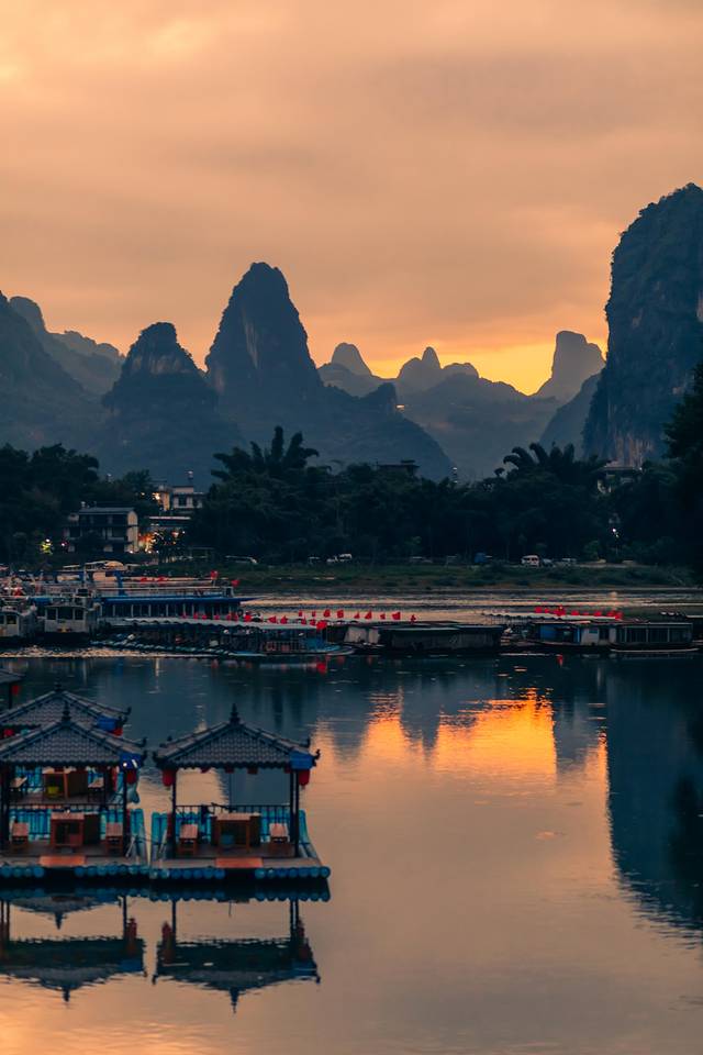 入秋之后,广西能看到日落日出是比较难得的。今天运气不错,看到了一点点落日的光,后期调的色调浓了一些。江水两侧的山峰高且险,大气悠远,漓江的喀斯特地貌是最美的。