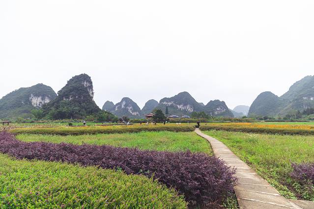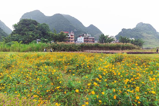 这条步道左边是遇龙河,右边是稻田,路两边还种着鲜花,这才是我心目中适合骑行的路。这里能看见不断有竹筏漂过,在河边拍照很好看。