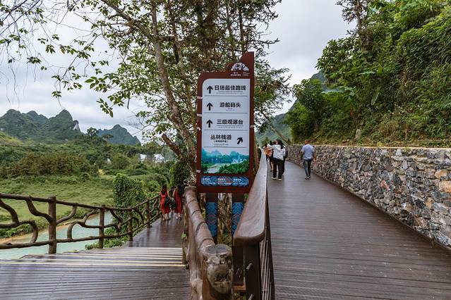 进入景区后分两条栈道,左边是去坐竹筏,近距离看瀑布。右边是丛林栈道,推荐一定要走丛林栈道上三级观景台,看瀑布全貌,更适合拍照。想坐竹筏的再往下走,这样不用走回头路。
