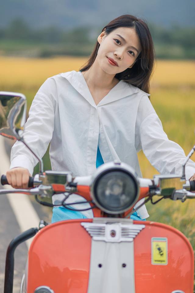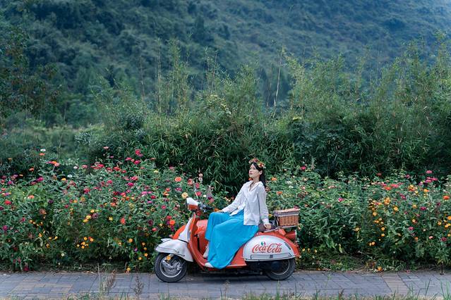 路两边也是五彩的鲜花,一边是遇龙河,一边是大片的稻田,只是比刚才的遇龙河步道多了一辆复古三轮车,以及这里可以把车开到稻田中间,因为有一条小路。