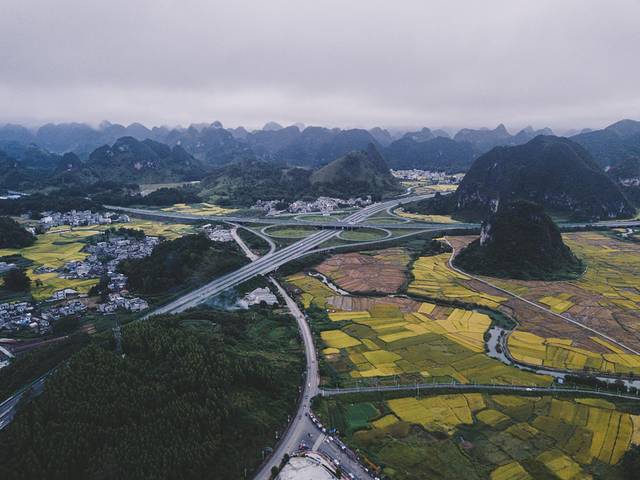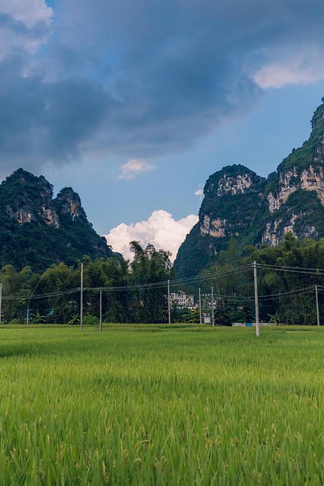 因为公路穿行的地区都是喀斯特地貌山区,穿梭在广西秀美的山水之间,沿途可欣赏喀斯特地貌所特有的奇山怪石。没有阳光的日子,我们一路与青缈的云雾为伴,路边是大片稻田,仿佛身在巨大的仙境画卷中行驶。据说最美的一段是百大特大桥路段,横穿三座大山,我们并未开到那段路。