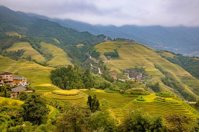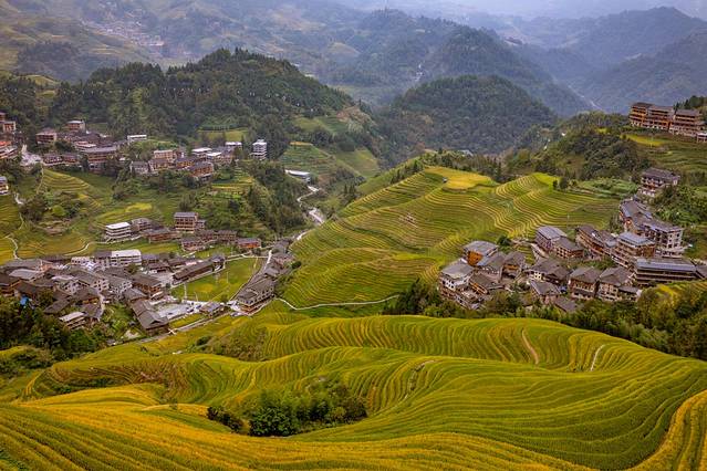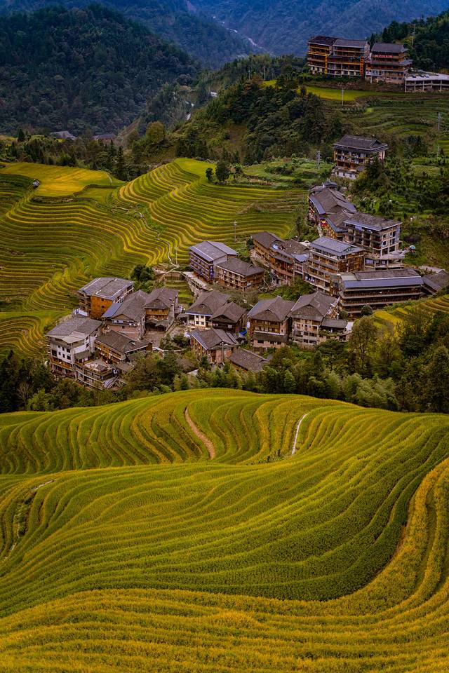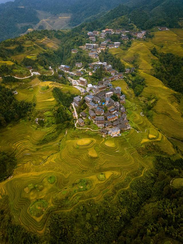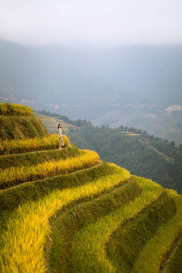 龙脊梯田是我此行最大的惊喜,10月份黄绿相间的千层天梯,仿佛从云霄散落,铺满大地。