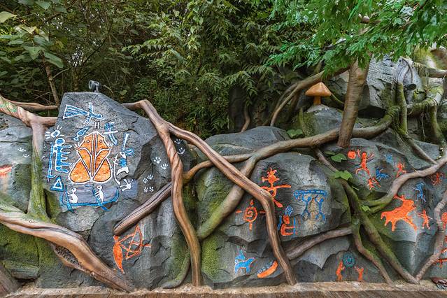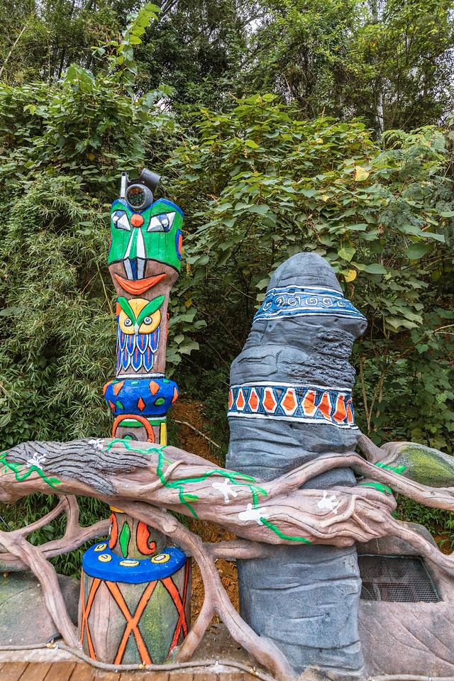 丛林栈道也是夜间游览步道,因为晚上景区有灯光秀,这条栈道上有五颜六色的灯光以及墙面绘画,夜游一共11幕(蚂拐节—寻蛙神—唤蛙神—创神迹—入人间—爱不得—花相助—定终身—花赐福—救苍生—祈雨来)。晚上还有灯光打在瀑布上,也很好看。夜间门票228元,开放时间19:00-21:30,最晚入园时间19:15;想呆一整天的话,全天门票340。