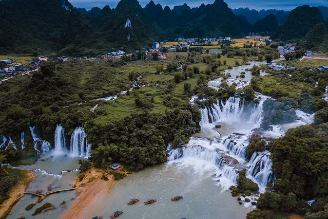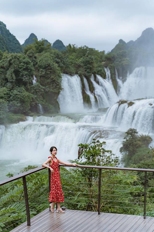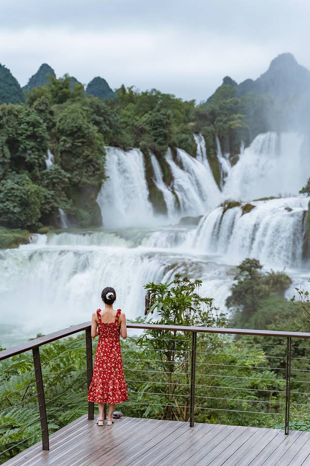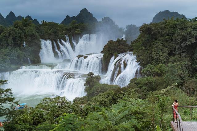瀑布横跨两国,归属我们的叫德天瀑布,越南的叫板约瀑布,雨季的时候两瀑布融为一体,全宽208米,更壮观。瀑布下游与瀑布顶端河床高差约6米,瀑水呈多束状。