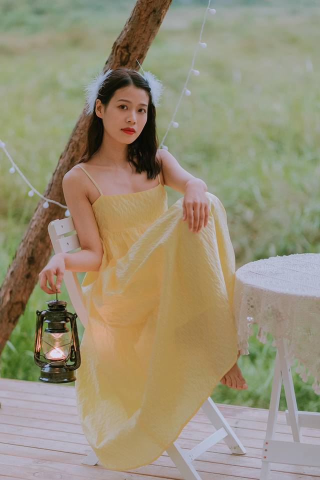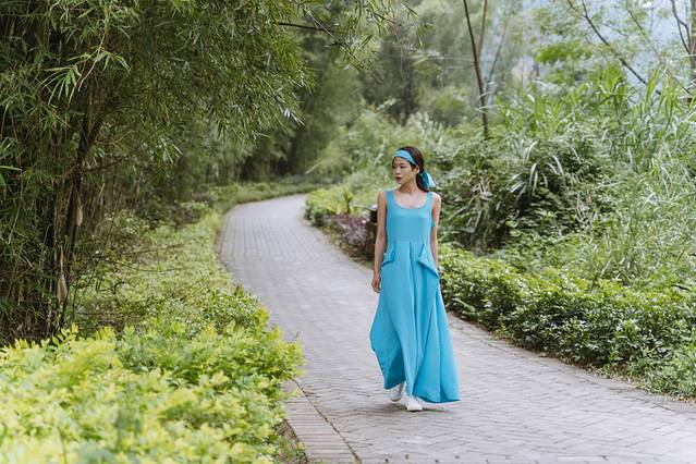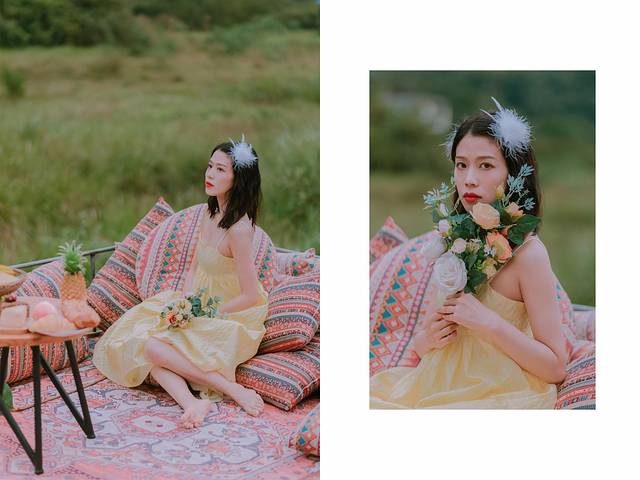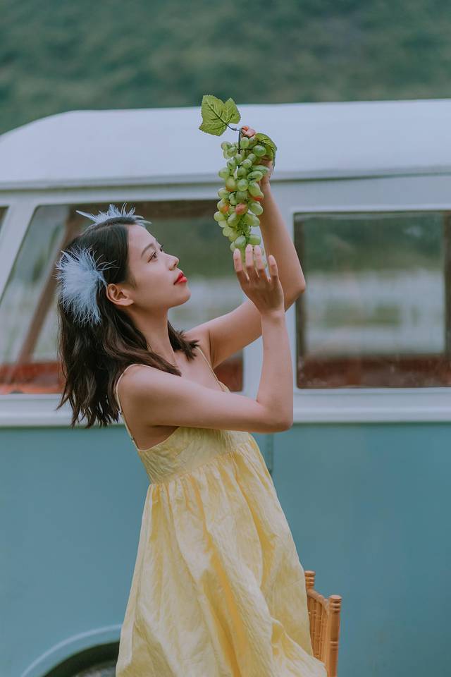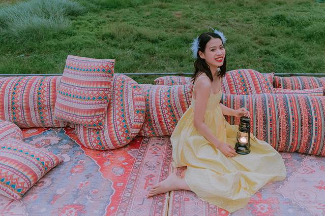 拍照场地也有一辆蓝色的复古小三轮,还有秋千、鸟巢等布景。刚想说这里应该弄一艘竹筏,那就不用在坐漂流的时候拍了。话音刚落,我就看到角落真的有一叶竹筏,惊喜加倍~