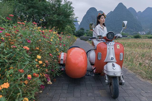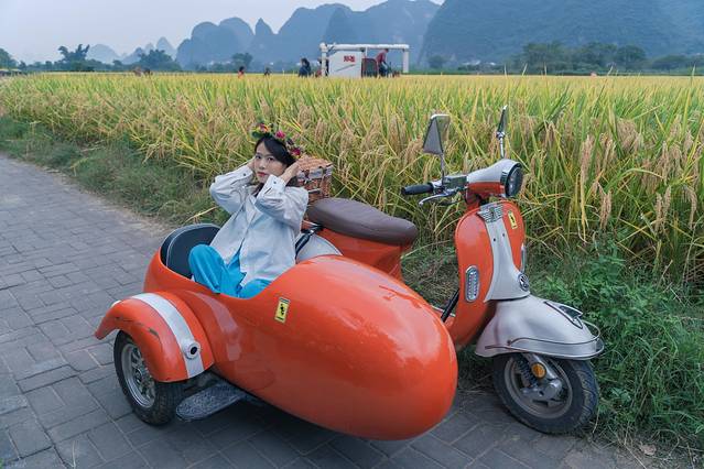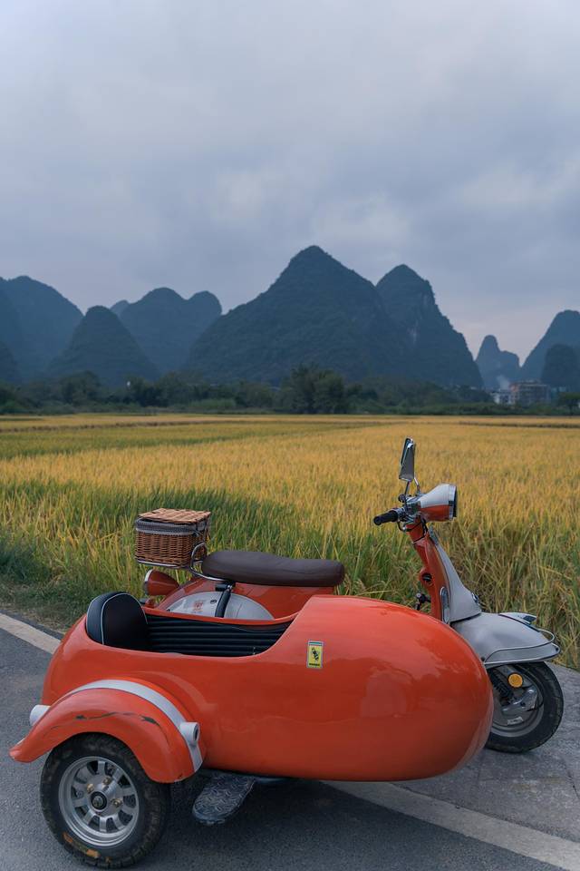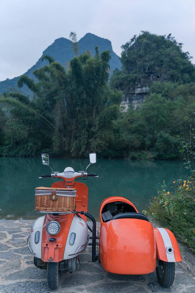 本来因为十里画廊心情很不好,回到民宿,突然看见我们隔壁民宿(芒果旅宿·阅山阅水亲子度假酒店)门口停着一辆挎斗三轮车,就是我一直心心念念想要租的车。一问价格要360,但是我知道市面价是260一天,于是我们扭头走了,后来前台追出来,说260租给我们,其实这时候已经是傍晚了,我们最多开2个小时,租给我们是明智的选择。